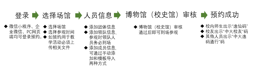 1)校内师生可通过企业微信工作台“博物馆(校史馆)预约”或者PC端网页进行预约。PC端网页访问网址为 https://bwgxsgticket.sysu.edu.cn/