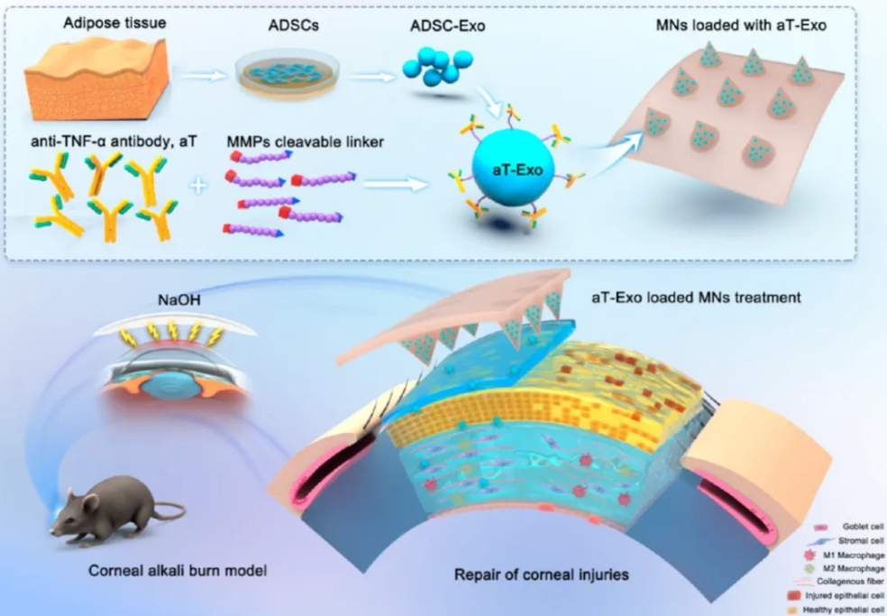 该研究通过构建aT-Exo,靶向抑制角膜碱烧伤引起的炎症反应,促进角膜的修复和再生,结合构建的PVA-MNs实现外泌体的精确和持续角膜递送,展示了工程化外泌体干预角膜炎症相关疾病的临床应用前景,同时证实微针技术在眼部生物活性纳米药物递送中的潜力 (图6) 。