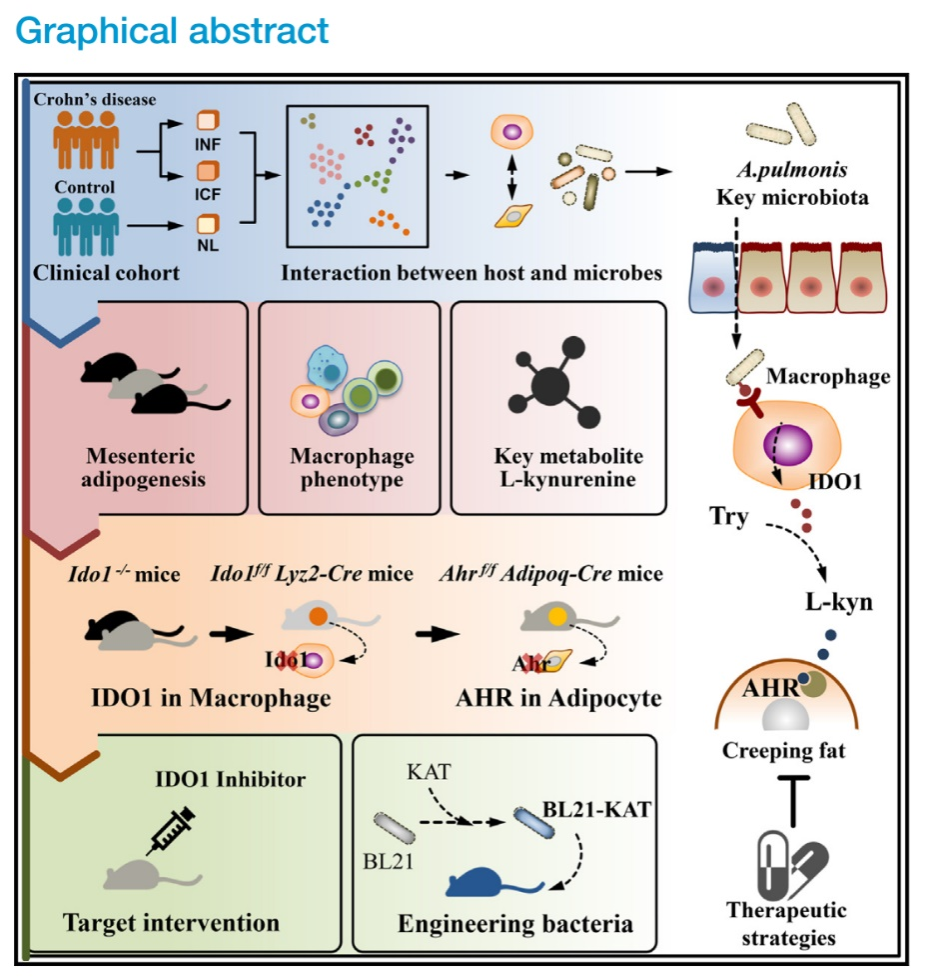 综上所述,本研究通过单细胞测序、靶向代谢组学测序以及多种动物模型,阐明了肠系膜微生物上调巨噬细胞的犬尿氨酸代谢,并通过脂肪细胞中的芳烃受体促进肠系膜脂肪形成。团队从微生物的角度出发,深入解析克罗恩病中爬行脂肪形成的机制,为克罗恩病的治疗提供潜在的治疗靶点,也为进一步改善克罗恩病患者预后提供了新的视角和方向。