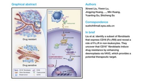 Recently, the research team directed by Prof. Shicheng Su from Sun Yat-sen Memorial Hospital, Sun Yat-sen University, revealed a new mechanism of the pro-tumor effect mediated by Fcγ receptor signals in non-leukocyte cells. This work entitled "CD16+ Fibroblasts Foster a Trastuzumab-Refractory Microenvironment That is Reversed by VAV2 Inhibition" was published online in Cancer Cell on Nov. 14th.