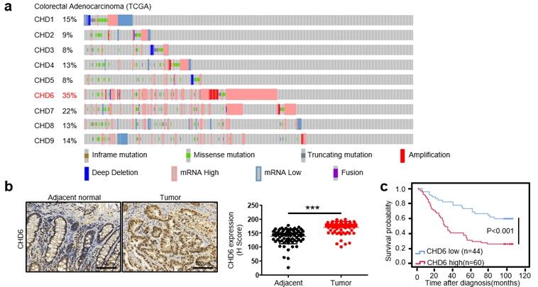 Figure 1 CHD6 is overexpressed in CRC and high CHD6 expression is correlated with poor overall survival in CRC patients